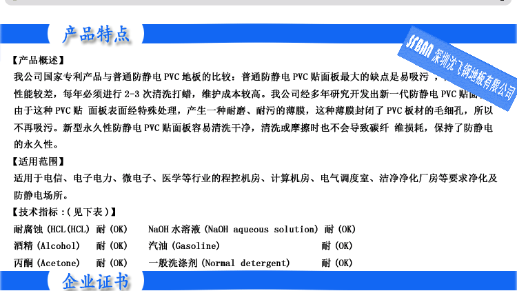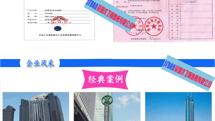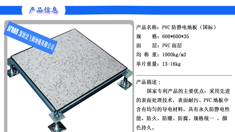 PVC全鋼高架地板 產(chǎn)品型號: 2.00MMPVC全鋼高架地板 規(guī)格: 600×600×35㎜ 產(chǎn)品說明: 永久性防靜電PVC地板是一種彈性均質(zhì)的氯乙烯地面材料,其內(nèi)部的PVC顆粒表面有一層導...